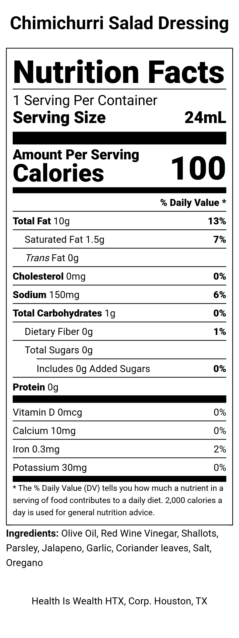 Add fresh, bold flavor to your salads with our Chimichurri Salad Dressing. Made with olive oil, red wine vinegar, lime juice, garlic, and herbs, it offers a zesty and herby taste with a touch of spice. At just 120 calories per serving and low in sodium and sugar, it’s a healthy choice. Use it on greens, veggies, or as a marinade to enhance any meal.